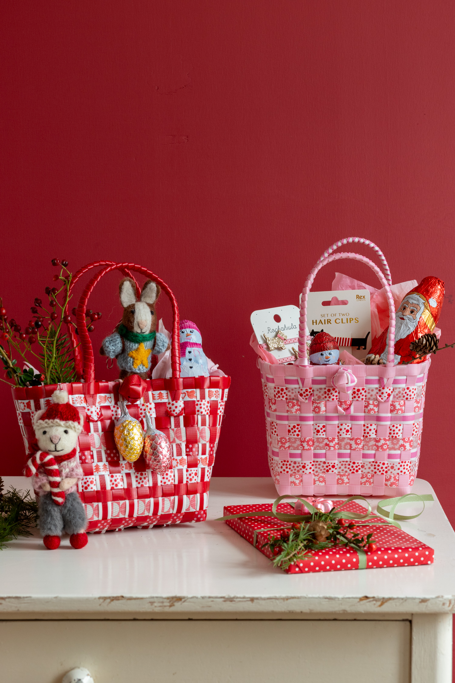 Passend zu den kleinen, bunten Flechttaschen gibt es auch große Markttaschen im gleichen Design. So kann im Partnerlook mit Mama oder Papa der gleiche Einkaufskorb benutzt werden.