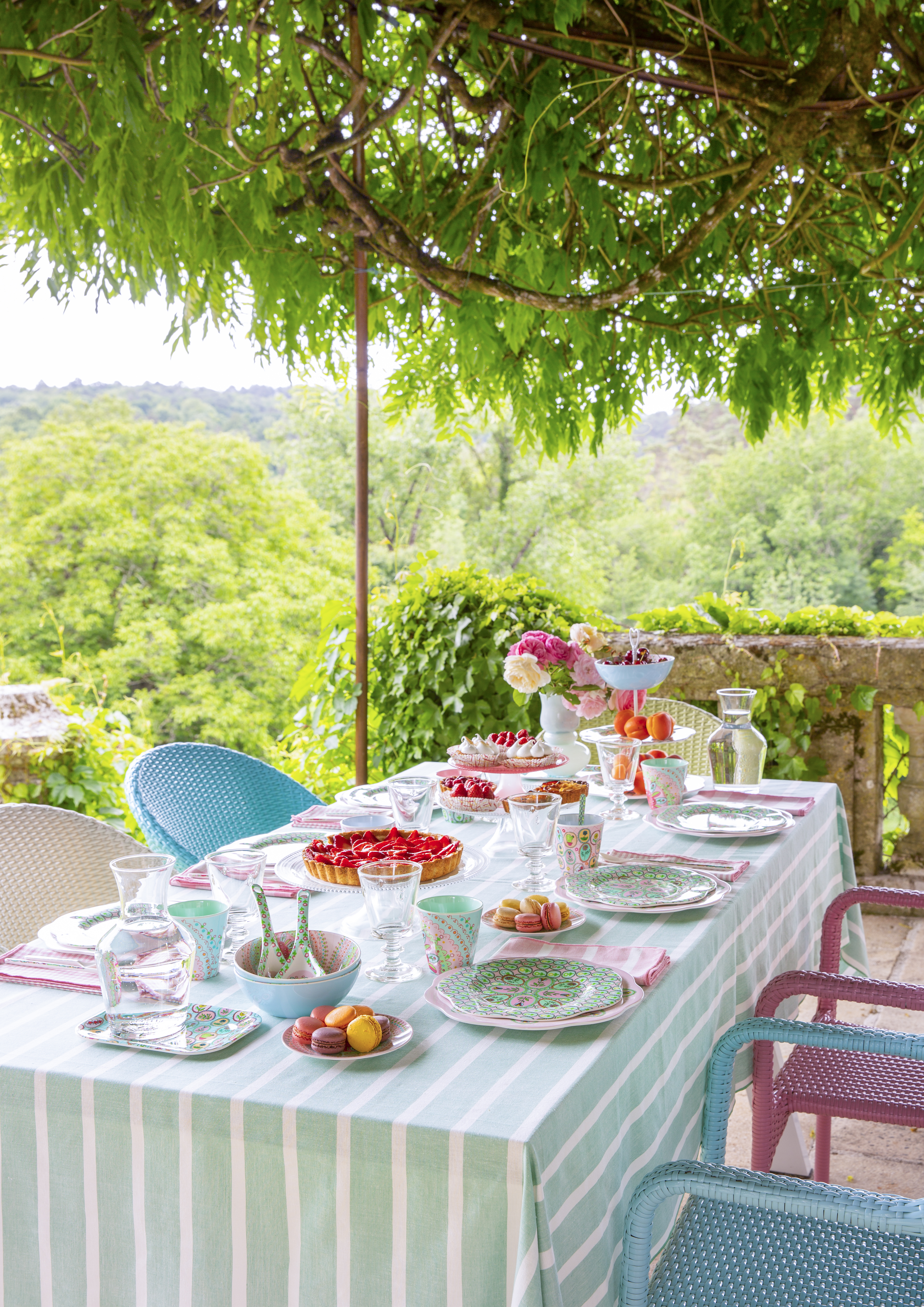 Die quadratische Tischdecke in frischem Mint ist nachhaltig, langlebig und immer wieder schön, z.B. für eine Tafel im Garten.